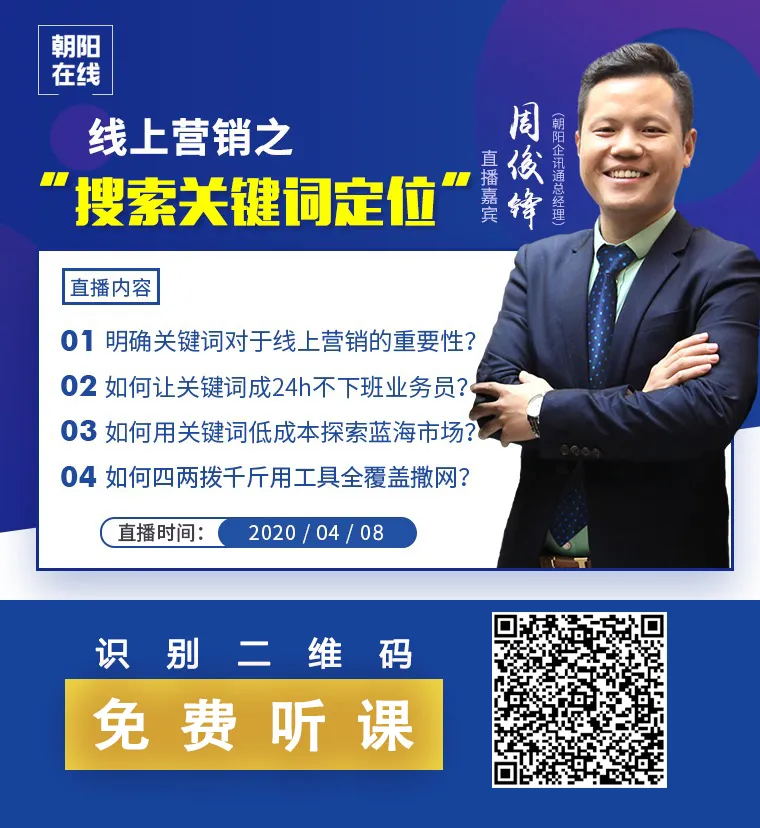 朝陽(yáng)在線全面啟動(dòng)免費(fèi)線上營(yíng)銷課程直播,這些課程幫助大部分企業(yè)解決“線上營(yíng)銷、盈利模式、如何布局遇到的問題。不僅適合互聯(lián)網(wǎng)運(yùn)營(yíng)、創(chuàng)業(yè)者們,更適合個(gè)人及商家學(xué)習(xí)。
